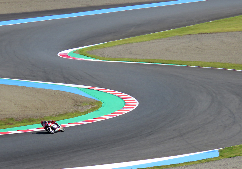 moto2になると、さすがに掛ける瞬間はコース上で、その後すぐにゼブラの上でブレーキングしている